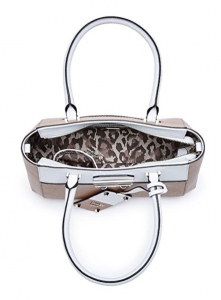 В дизайне элегантной женской мини-сумочки Guess сочетаются белые и бежевые оттенки.